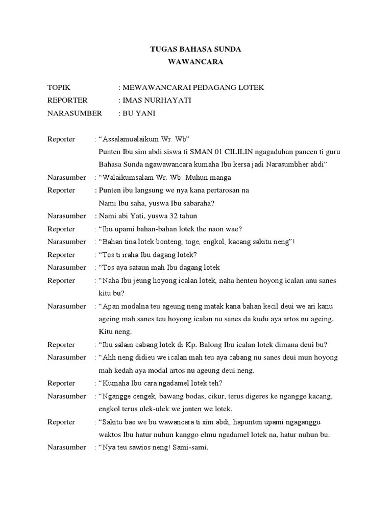 Struktur teks wawancara bahasa sunda. Punteun bu, abdi ngaganggu waktos ibu sakedap? Contoh wawancara bahasa sunda tentang profesi seseorang. Contoh laporan wawancara bahasa sunda ilmusosial id contoh gambar susunan makalah hasil wawancara bahasa sunda contoh laporan wawancara . Materi pembelajaran bahasa sunda materi warta sunda.